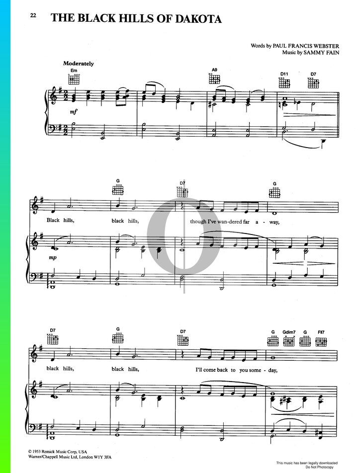 The Black Hills Of Dakota Sheet Music Sammy Fain Piano, Vocal & Guitar Chords