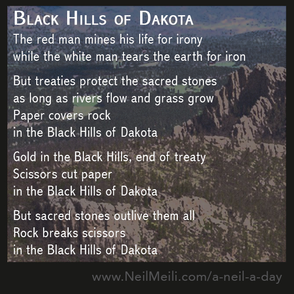 Take me back to the black hills The black hills of Dakota To the beautiful Indian country That I love Lost my heart in the black hills The black hills of Dakota Where the pines are so high That they kiss the sky above And when I get that lonesome feelin' And I'm miles away from home I hear the voice of the mystic mountains Callin' me back home