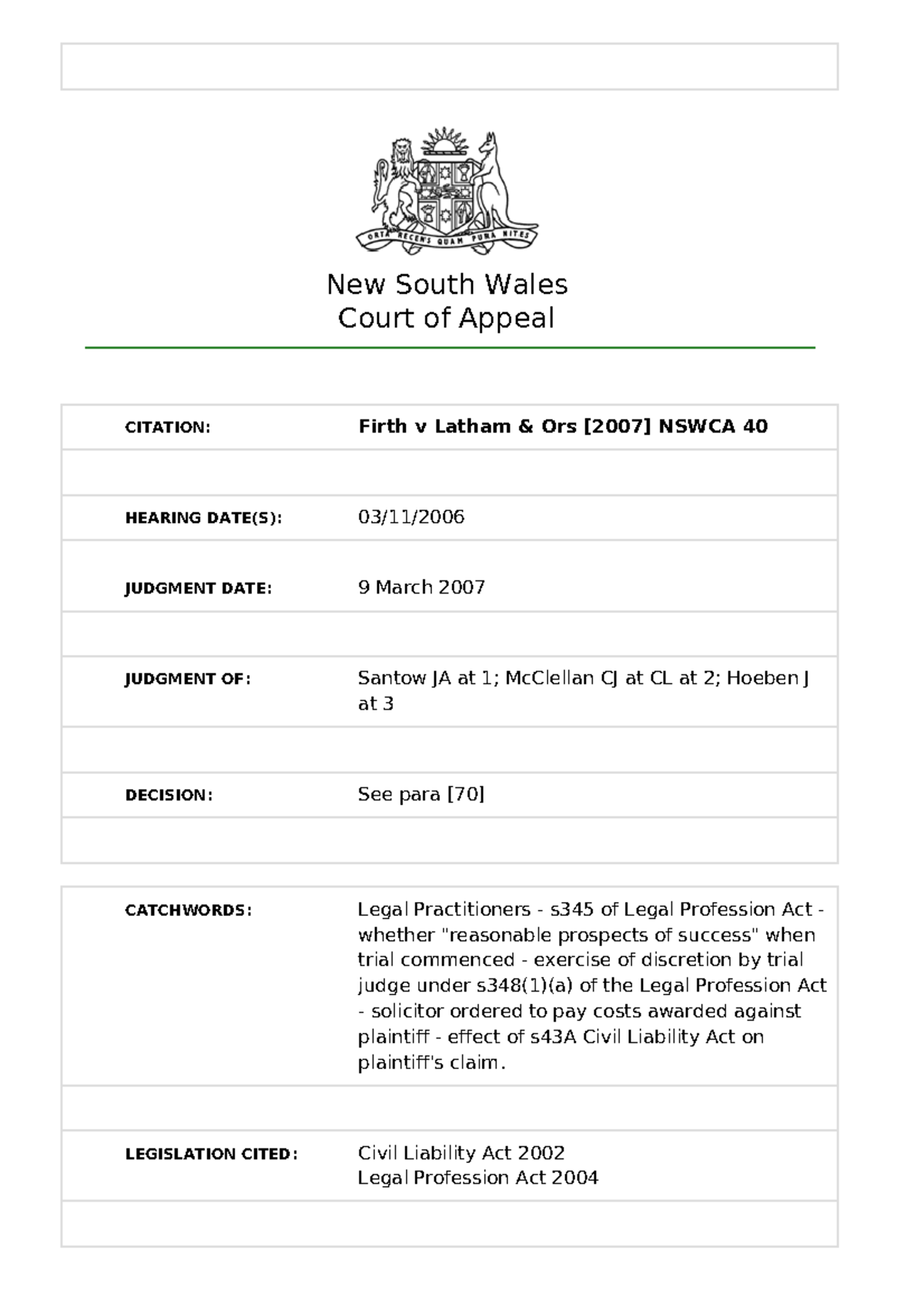 Firth v Latham case law The security of cose New South Wales Court of Appeal CITATION Firth v